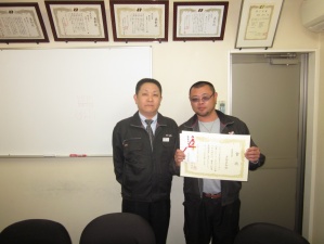 特に、社員スローガンは、当社に携わるスタッフ、合計84名から、公募をしました。102作品の中から、ノミネート作品10作品が選ばれ、スタッフ全員で投票を行いました。2作品が同票数で並んでしまい、決選投票の結果、選ばれたものが下記の作品です。今回で5回目を迎えたスローガン公募ですが、年々、その作品のレベルは上がっております。安全運転安全作業の励行を目指す上で、まずはその意識が大事であります。スタッフの皆様、ご協力、有難うございました。(写真は、社員スローガン受賞者上位3名の方々です。)